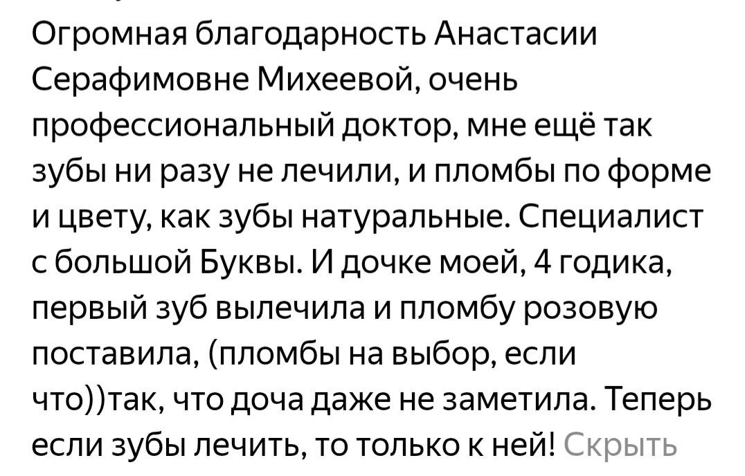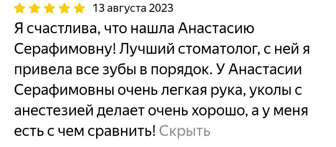 Очень люблю своих пациентов, рада делать Вам красивые улыбки и спасибо за доверие! Жду Вас у себя на приеме.
